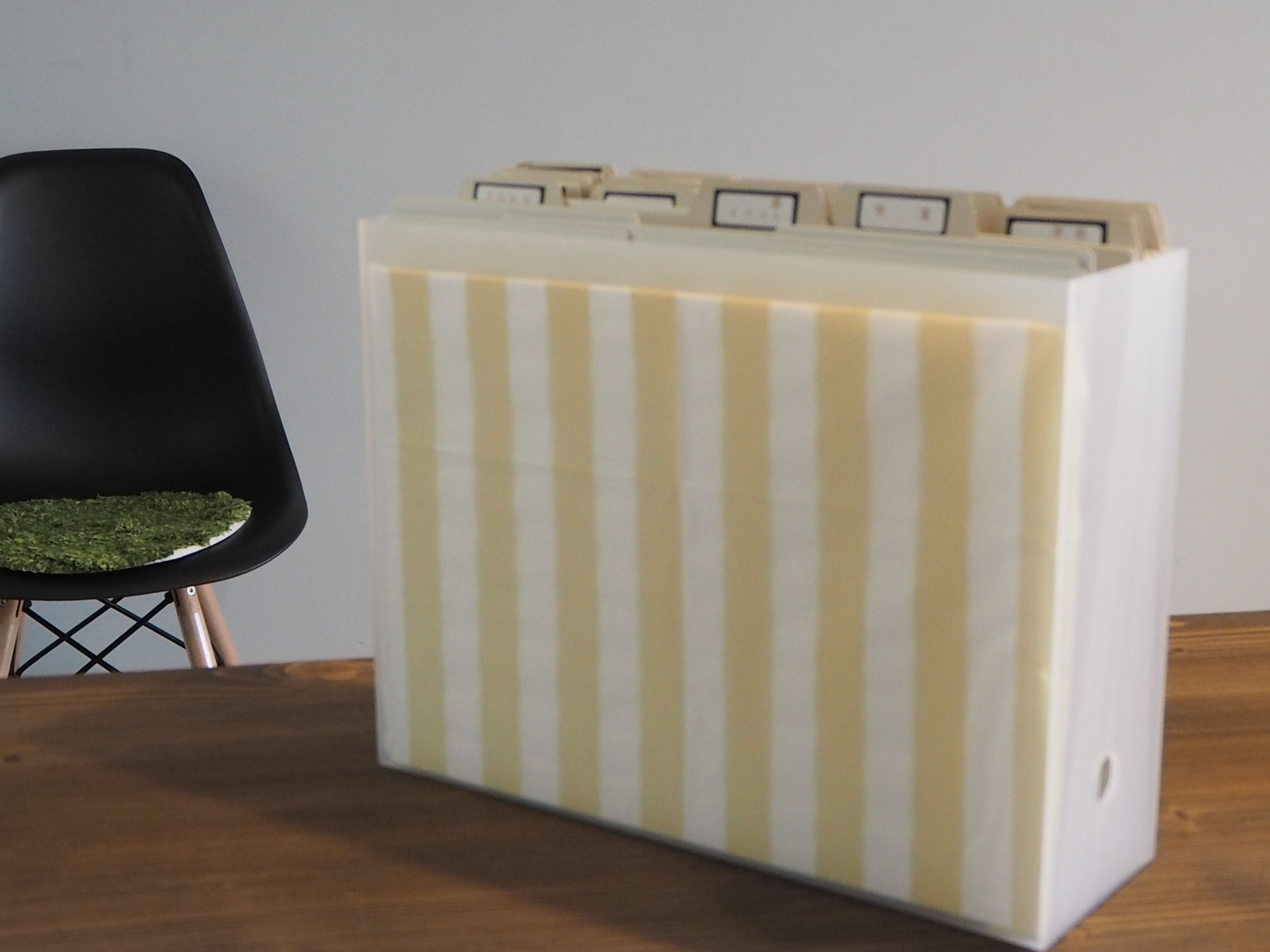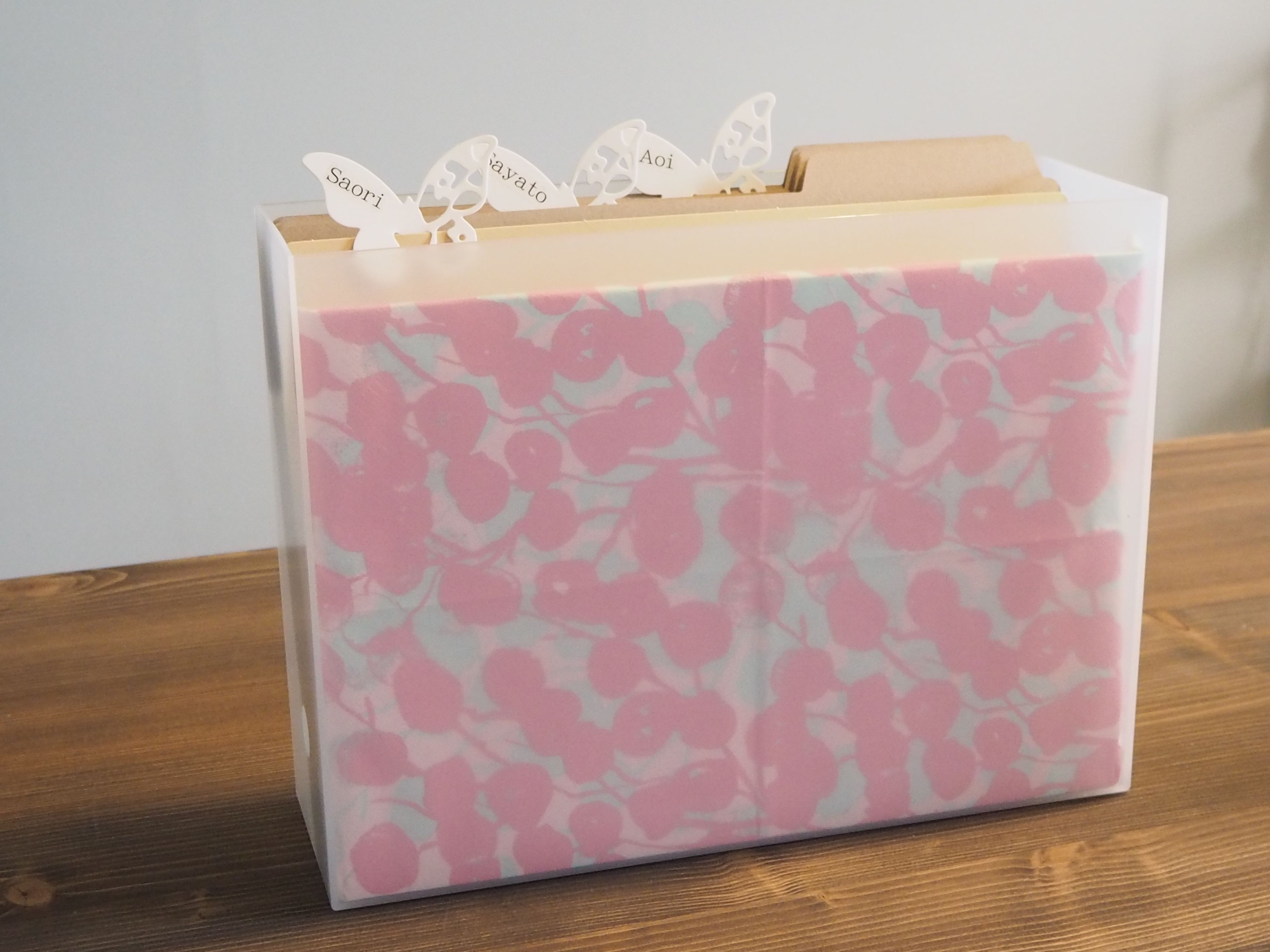 厚紙に100均のペーパーナプキンを両面テープで貼って側面に入れるといろいろアレンジできちゃいます。ペーパーナプキンなら手軽に張り替えられるのもうれしいところ。