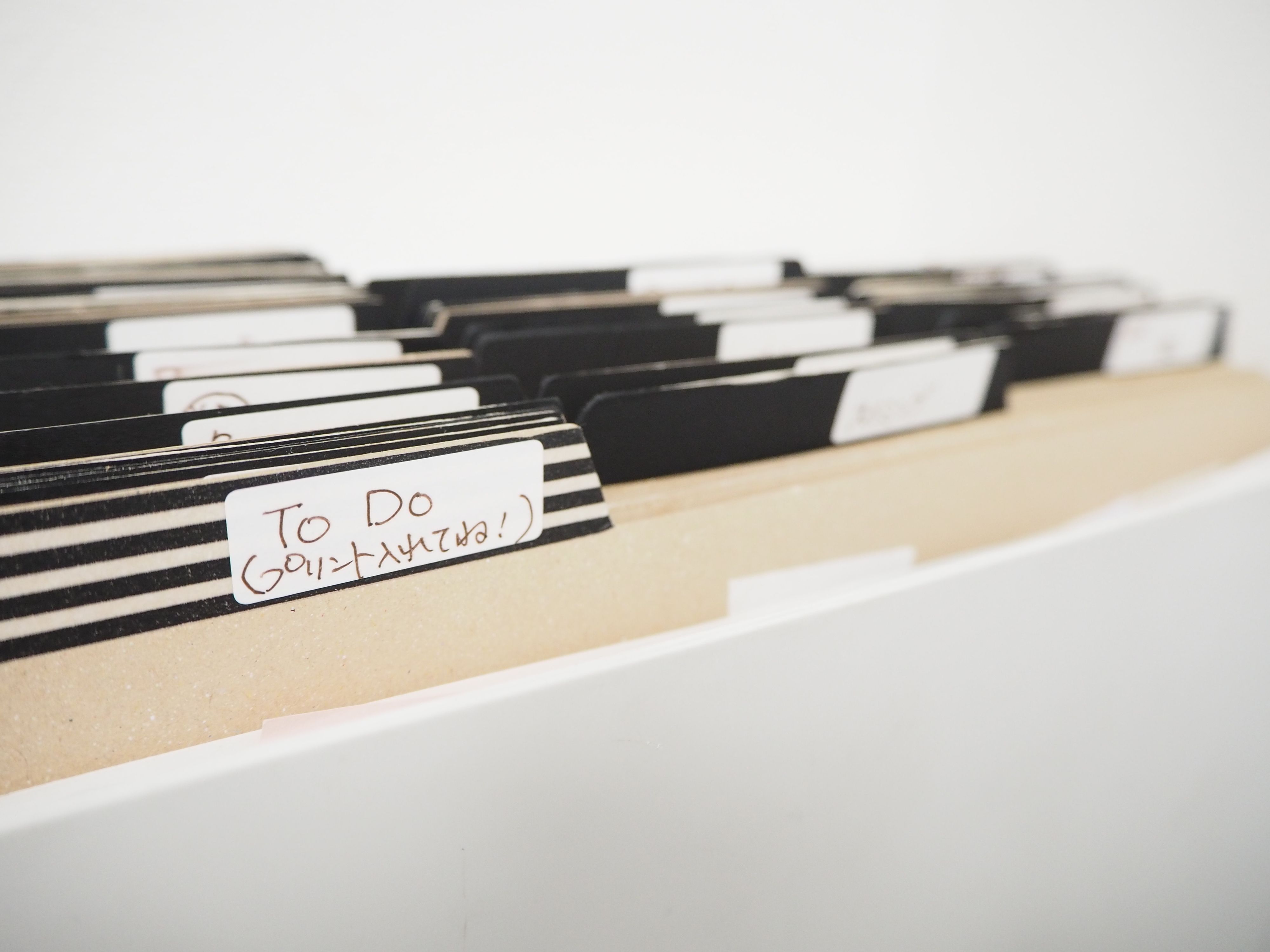 ちなみにわが家は子ども3人分を1Boxで管理をしたいので3つ山を使用しています。ママ&第一子&第二子でもいいですね。人別に山の列をつくり管理しやすくしています。手前から奥へ今週のこと~今月のこと~今年度のこと~卒業まで~一生のことと並べています。