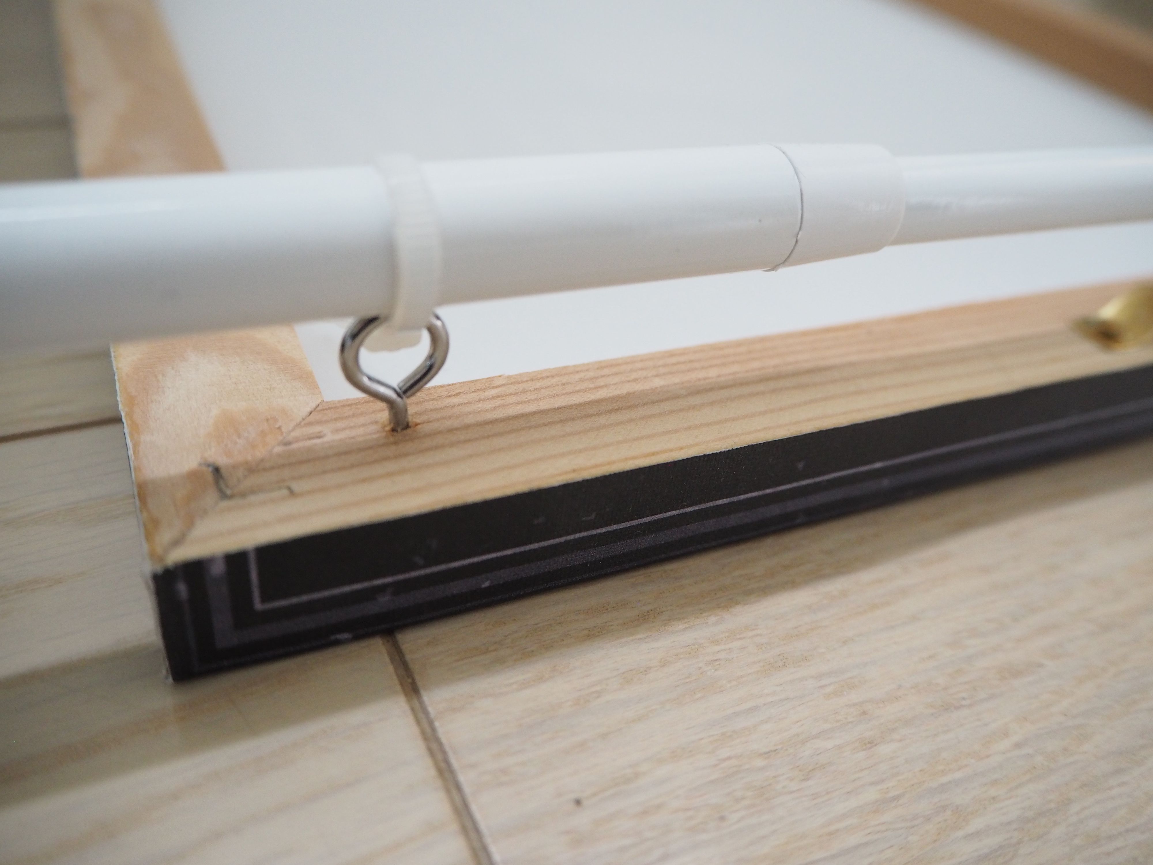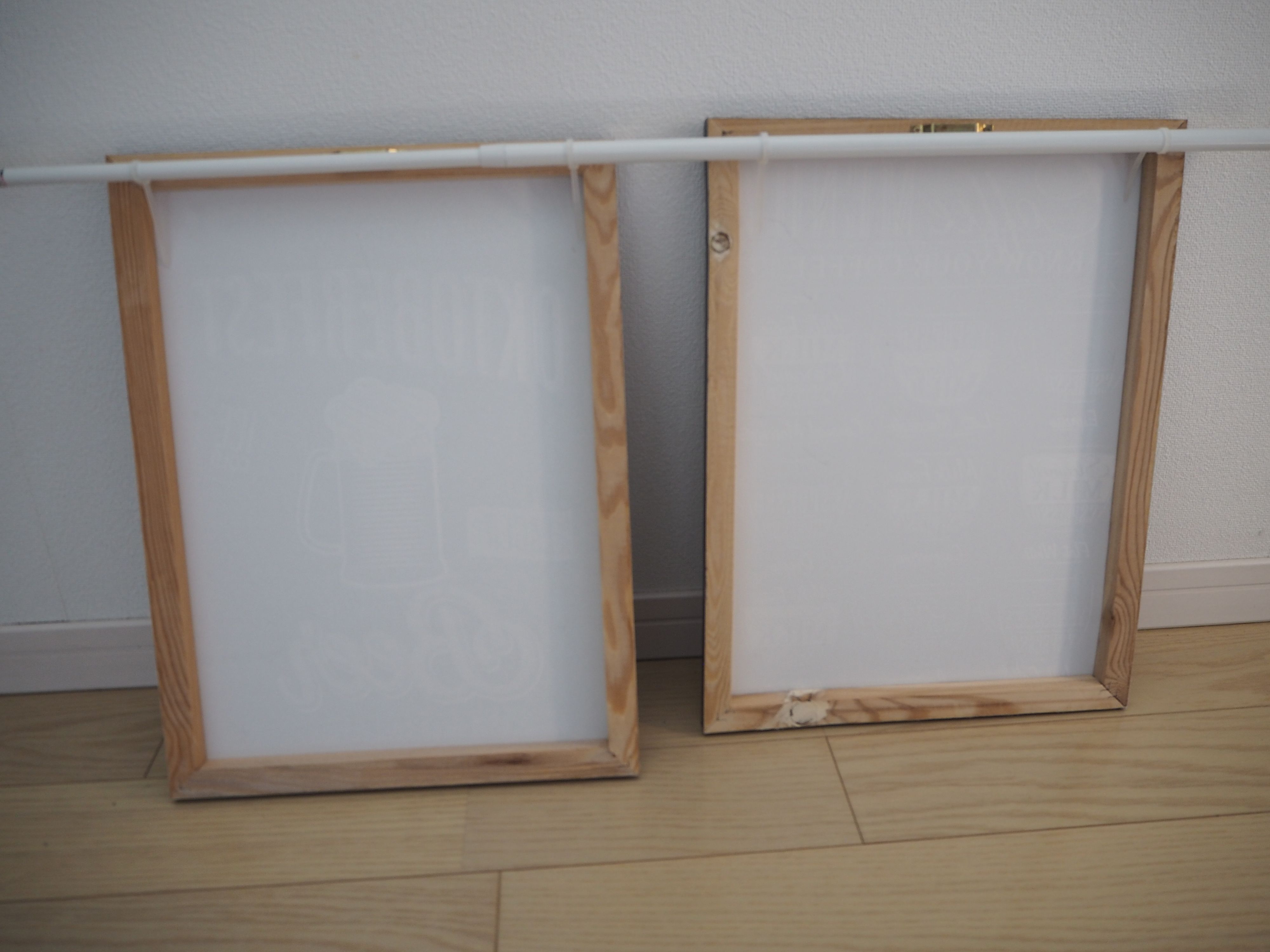突っ張り棒にヒートン(頭が丸い輪になったネジ)と結束バントを使ってキャンバスパネルを留めるだけ。