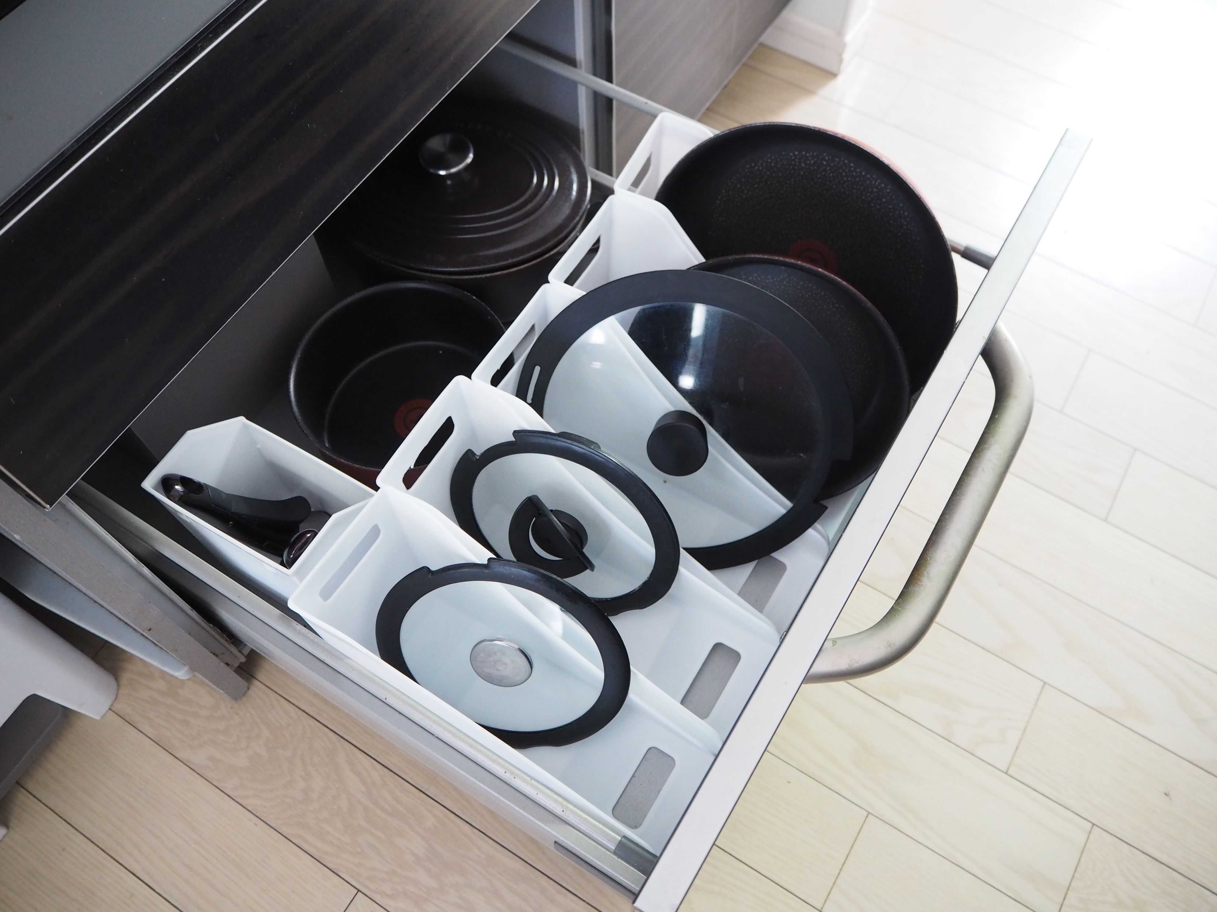 引き出し式のキッチンのいいところは、上からのぞいて奥まで見渡せ、ぱっととりだせるところ。でもそんな引き出しにお鍋やフライパンを重ねて置いてしてしまうと下のフライパンが取りたくてもすぐには取り出せません。片づくキッチンにしたいならば断然「立てる収納」が正解。そんな時便利なのがファイル立てです。ポイントは両側オープンなものを選ぶこと。