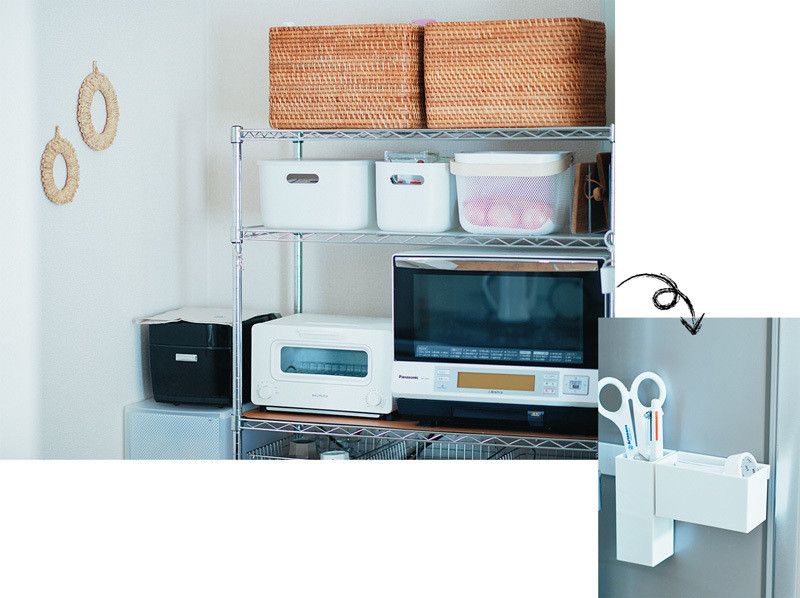 食材の袋の口を切ったり、留めたり、ちょっとメモをしたり。キッチンではなにかと必要な文房具類。リビングで使うものとは分け、キッチン用をまとめて冷蔵庫横に。無印良品のマグネット式のケースを利用して定位置をつくっています。