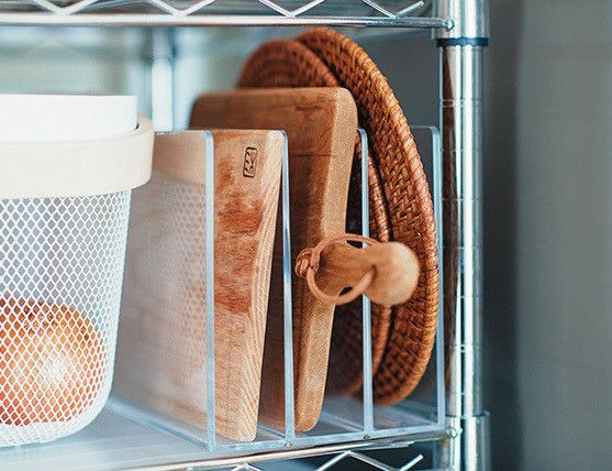 カッティングボードやトレーは、アクリル製のスタンドに立てて収納。重ねていないので、上のものをどかす手間をかけずに取り出せます。「いろいろなタイプを試した結果、無印良品のものに。丈夫で安定感があるので愛用中」。