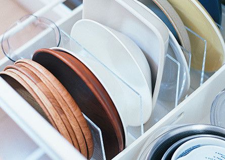 調理台下の引き出しの中にも、同じシリーズのアクリル製のスタンドを使用。大皿を立ててしまうことで、スムーズに出し入れできるようにしています。引き出しを開ければ、ひと目でど