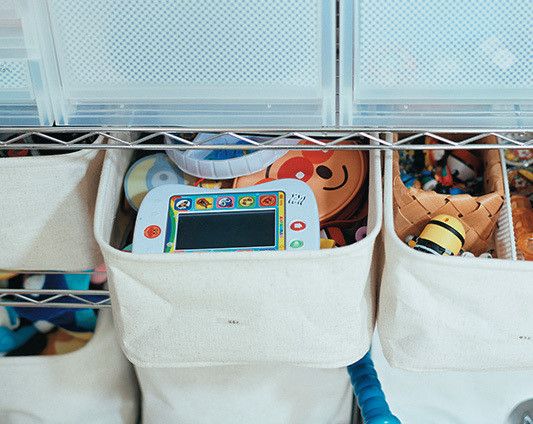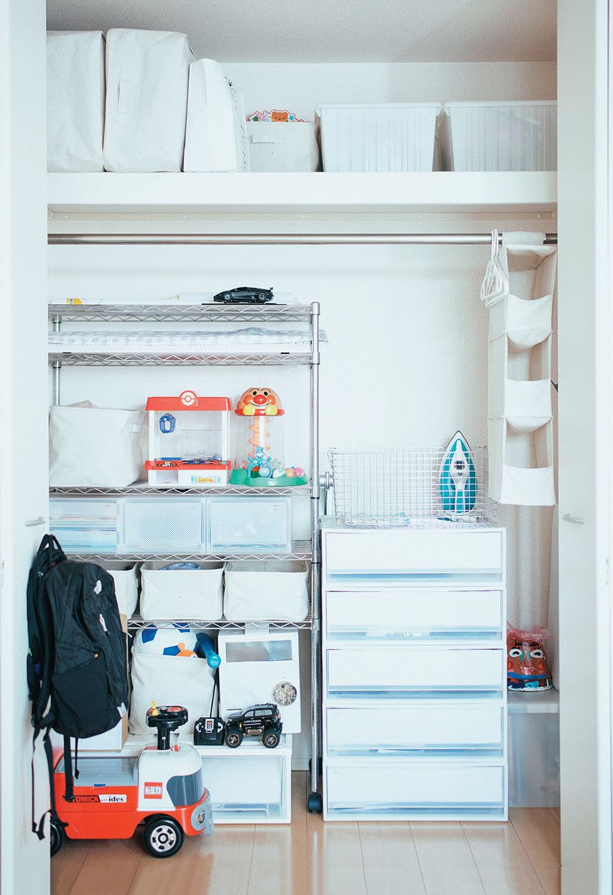 しまうためのアクションは少なくするのがコツ。クローゼットのドアを開けるというひと手間が増えるだけで、片づけが面倒になります。ドアを常にオープンにすれば、子どもたちが自分で片づけするようになりました。