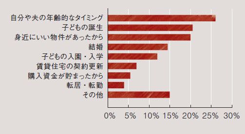 年齢のほか、子どもがきっかけに購入年齢の項目でもあったように、ローン返済を考えたタイミングが多かったよう。また、子どもの誕生や入園・入学など、子どもの成長に合わせて家の購入に踏み切る人も目立ちました