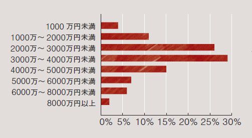3000 万円の家なら、例えば頭金500万円、ボーナス払いなし、金利0.7%、35 年ローンだと、月々の返済が7 万円弱なので家賃より割安になる家庭も。なかには、500万円未満という人が1%、8000万~1億円未満の人が2%いました