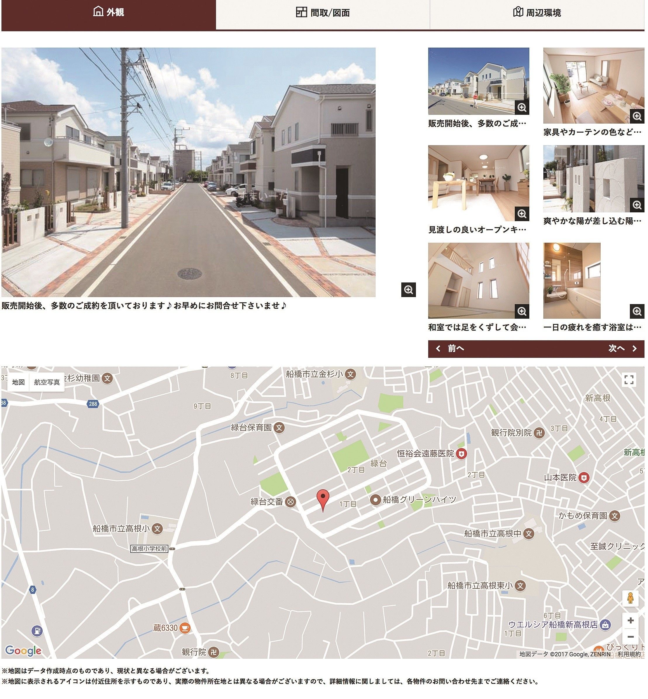 検索でリストアップされた物件から、外観や面積、間取りなどの情報にぱっとアクセスできます。近所のスーパーや小中学校など、周辺情報も掲載。画像も豊富でイメージがわきやすいですよ。