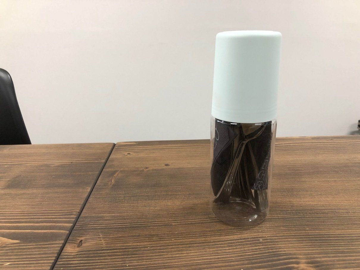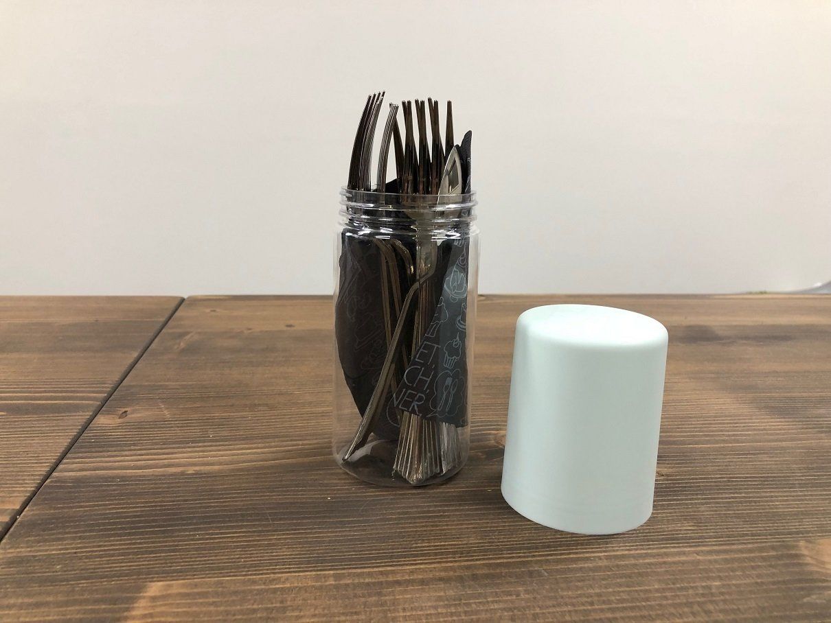 「セリアのボトル型ペンケース」のサイズは、直径約67×196mm。商品名のとおり、本来はペンケースとして使うものなのですが、透明で中身が見やすく取り出しやすい構造は、カトラリーを入れるのにもピッタリ!