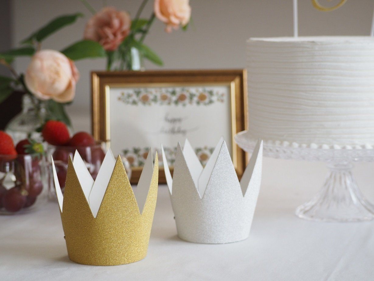 グリッターがキラキラとかわいいペーパークラウンは、主役にかぶってもらうのにぴったりのアイテム。ダイソーのペーパークラウンはグリッターがポロポロと落ちることがないのでテーブル上の飾りとして置いておいても◎。
