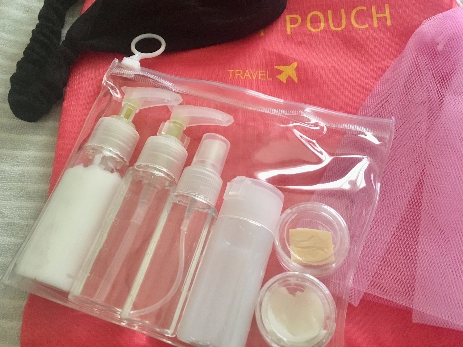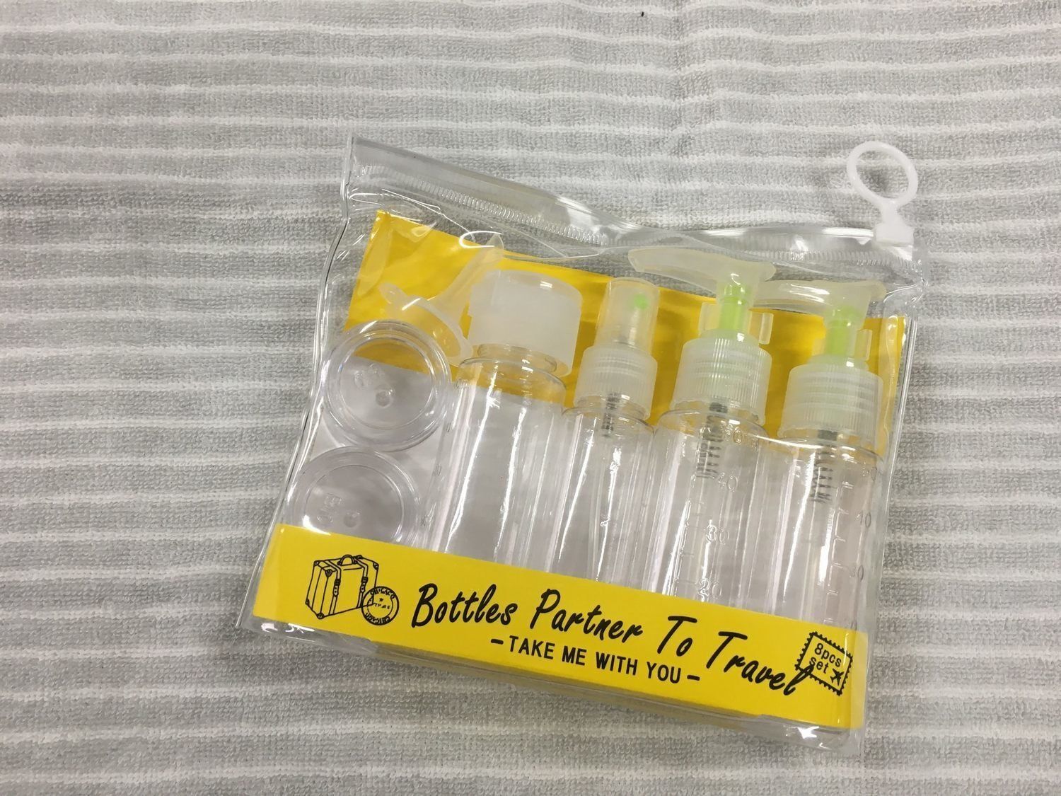 3COINSで購入した「トラベルボトルセット」。価格は300円。セット内容は、透明ポーチにポンプボトル×2個、スプレーボトル×1個、ワンドロップボトル×1個、クリームケース×2個、ヘラ、ミニ漏斗の計9点となっています。