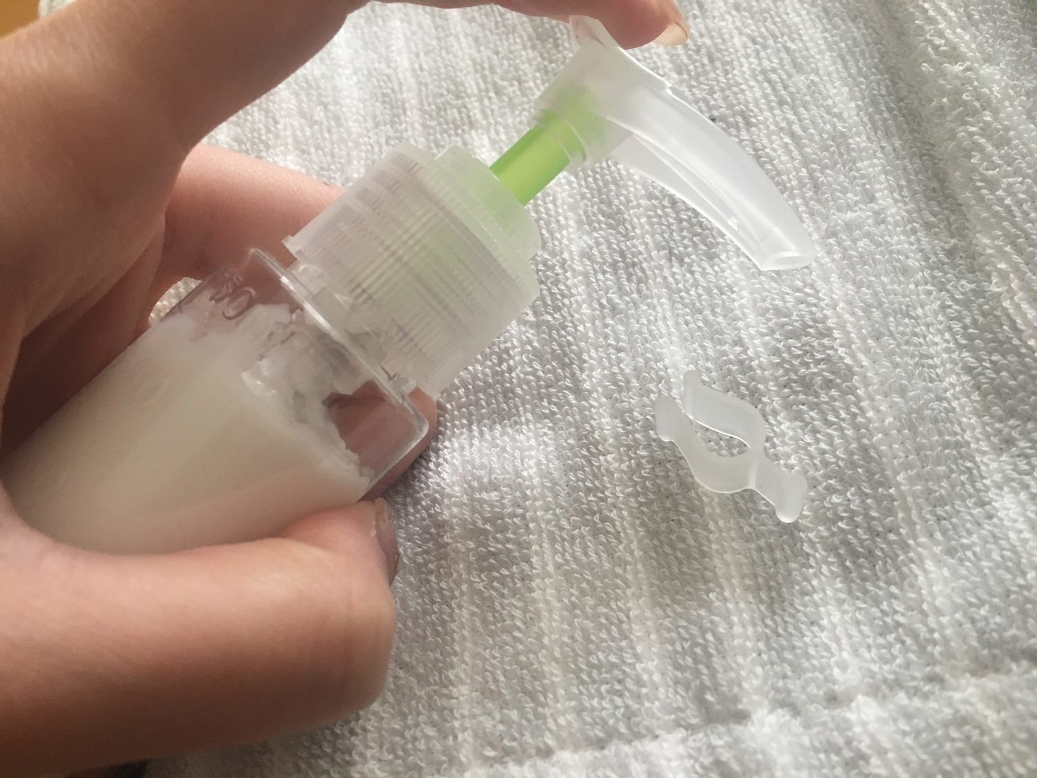 2つ入っているプッシュ式ボトルは、内容量50ml。私は美容液とメイク落としを入れました。ストッパーが付いているので、移動中に中身が出るような心配も無さそう。ヘアクリームなどを入れるのもよさそうですね。