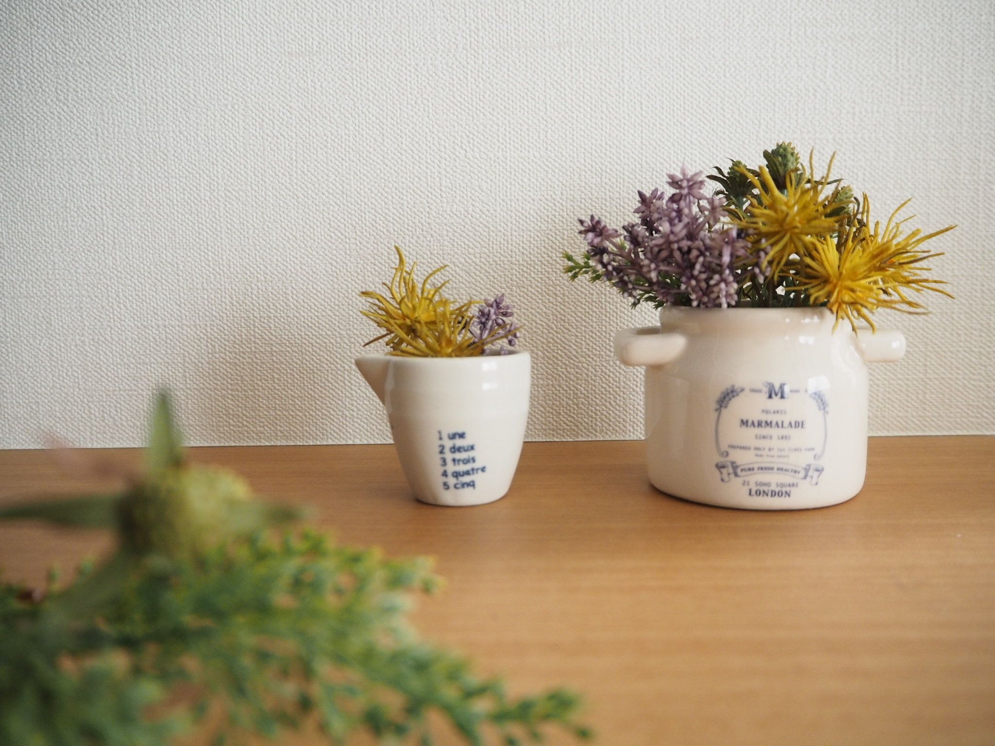 ここ最近、たくさんの種類が発売されているのが、ドライ風フラワーのシリーズ。造花の原色のイメージを打ち破るスモーキーなカラーがとても素敵。小瓶に飾ったりしてもかわいいですよ!
