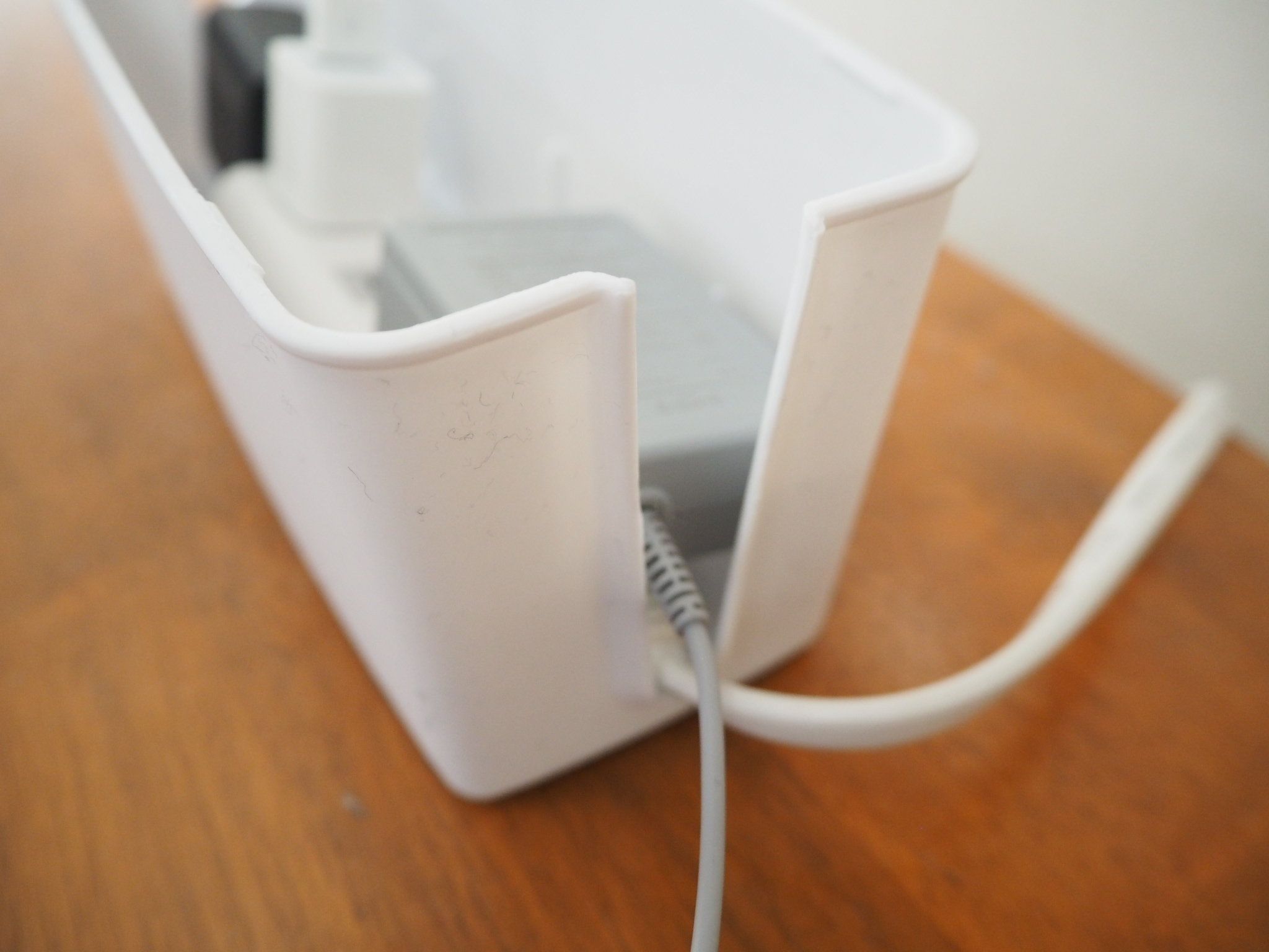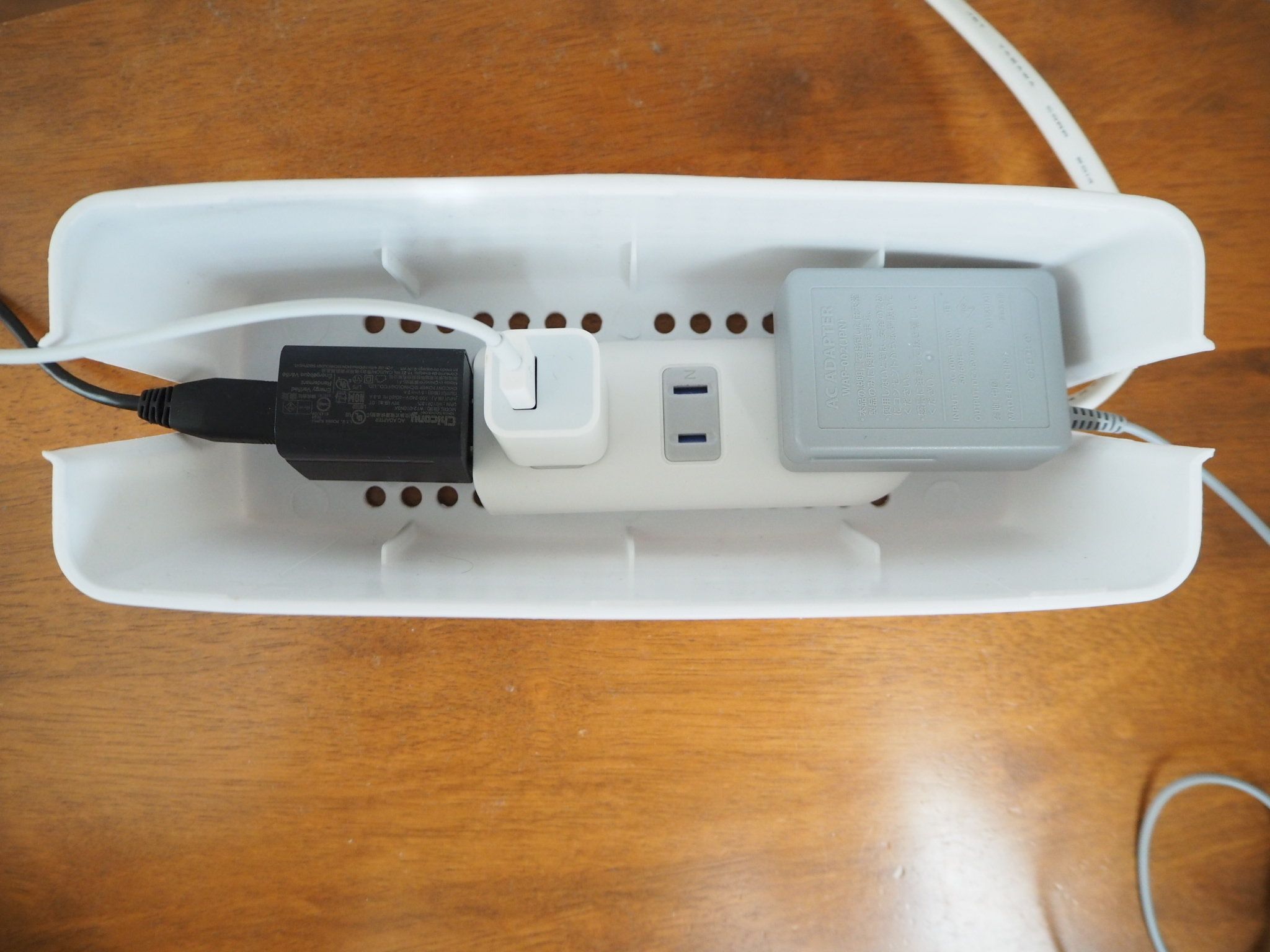 ケーブルボックスは内寸が225×80×86(mm)。高さ部分が86mmと少し低めなので、パソコン等の高さがあるアダプタはちょっと無理そう……ということで、我が家ではゲーム機器や充電器回りの配線をすっきりさせることにしました。下に穴が空いているので熱がこもるという心配もクリア!