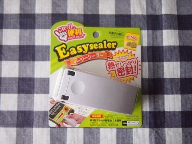 袋をはさんでスライドすれば、熱でしっかり密封してくれるダイソーの“イージーシーラー”108円(税込)。単三電池2本使用します(別売)。