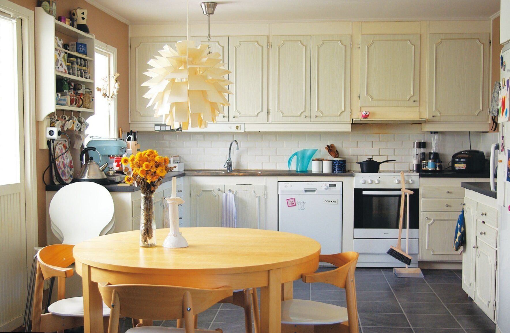 「わが家はリビングとキッチンがひと続きなのがお気に入り。家が建てられた時代の雰囲気を残しつつ、北欧らしい家具や好きな物を取り入れています」。どの家にもある飾り窓などあちこちにお気に入りの雑貨や花が。
