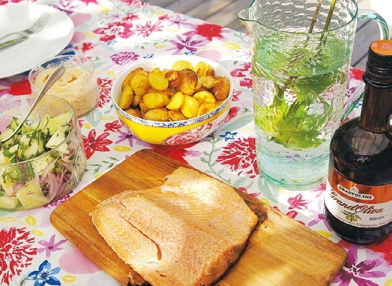 バーベキューグリルでシンプルに肉や野菜を焼いた料理が多いので、調理や後片づけもラク!「夏のウッドデッキは、第二のリビングのようなもの。どのお宅もウッドデッキにソファを置いて、夏の家族だんらんを楽しんでいます」。
