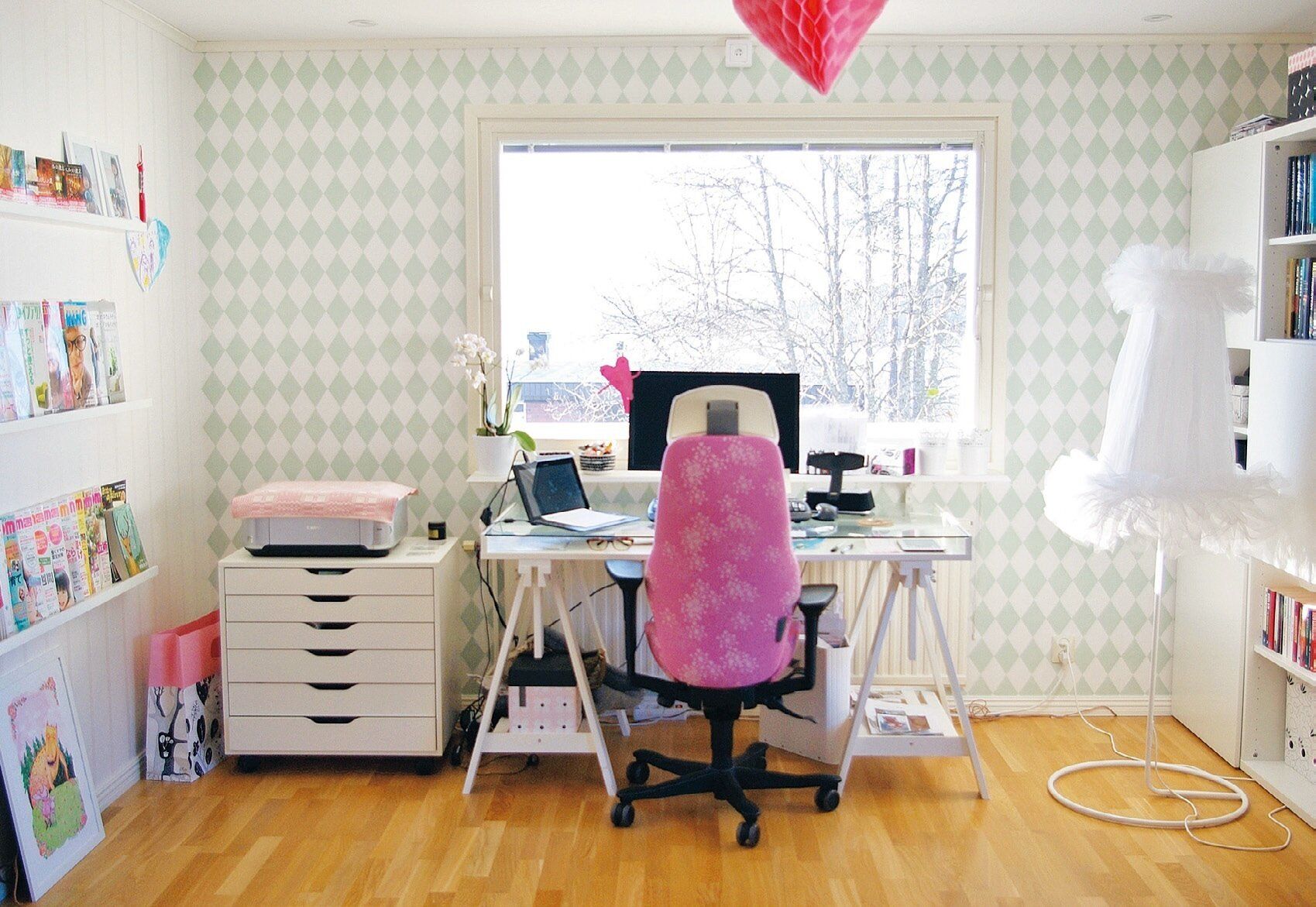 リビングの一角にある久山さんの仕事場は壁紙や家具を好きなテイストで統一。ふと視線を上げると窓から見える海が心に潤いを与えてくれる。