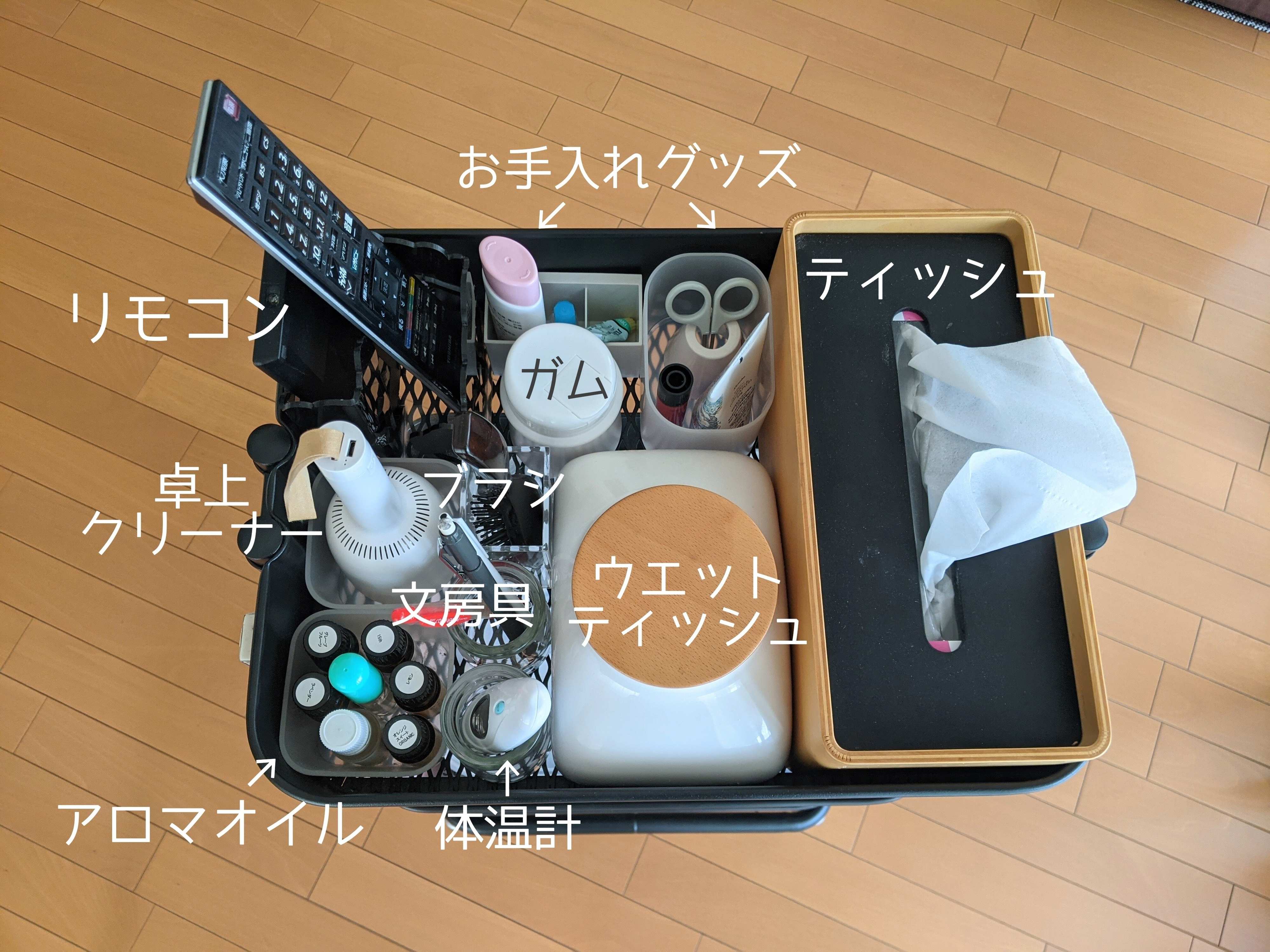 家族が集まるベストポジションに設置したワゴンには、使用頻度が高いもの、面倒だけどやっておいたほうがよいものをまとめています。
