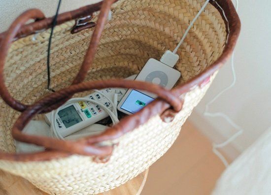 充電も音楽を聴くときも、機器類はかごの中にざっくり入れるだけ。