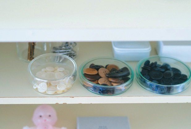 40体ほどもコレクションしていたこけし。2体だけ残し、いつもは隠して時々愛でます。ボタンもシャーレに入れて飾るとかわいい。