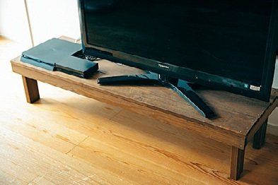 「ウッドデッキとフェンスで余った建材を組み合わせ、テレビ台を作りました。また、古くなったダイニングテーブルはペンキを塗り替えてリメイクし、買わずにやりくり」