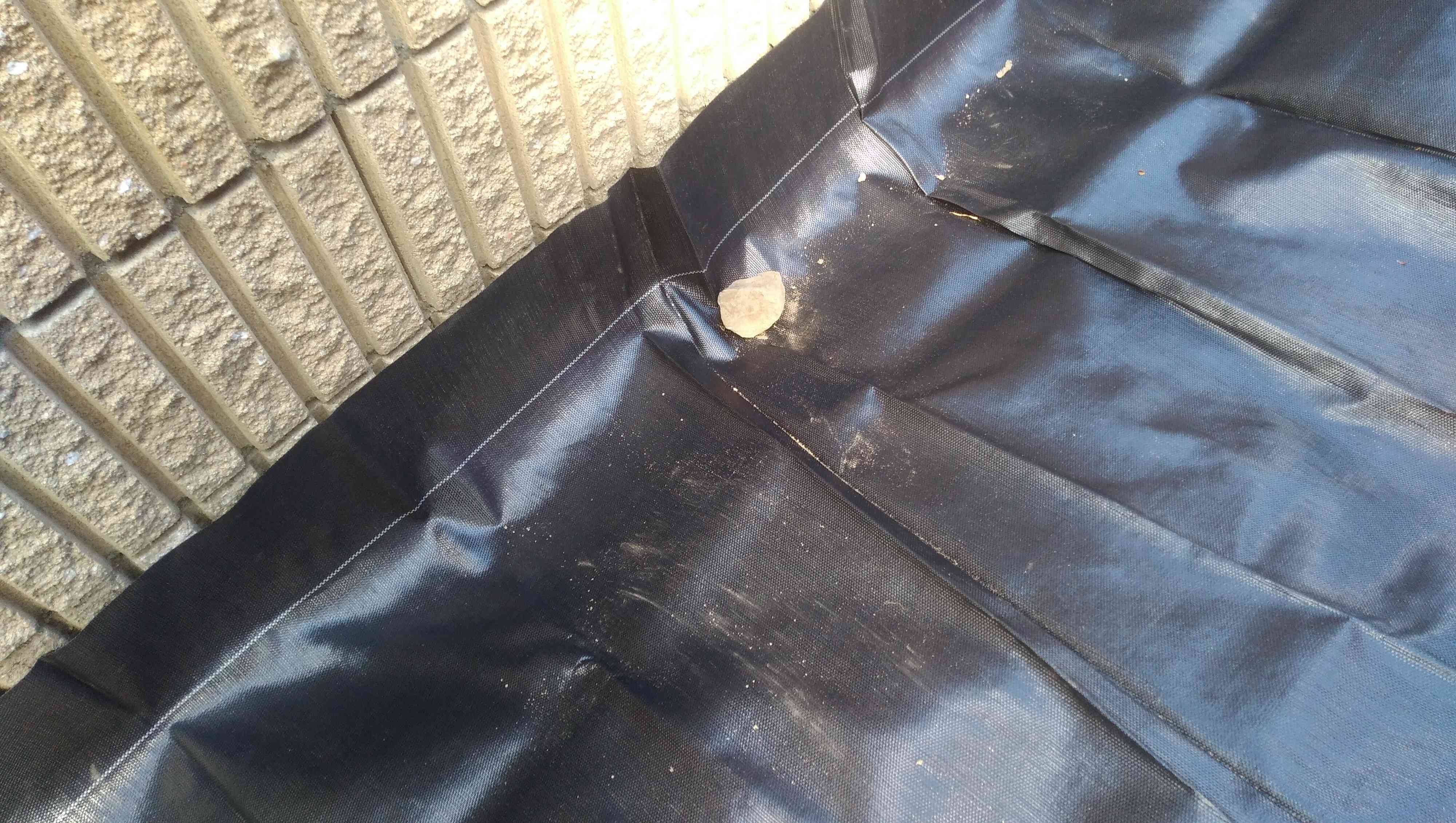 塀側は少しシートを余らせるくらいでピンを刺して固定していきます。余っている部分は砂利を敷けば隠れるので大丈夫です。
