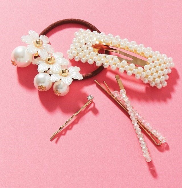 大ぶりのパールはフォーマルにも。バレッタもパールがぎっしり!