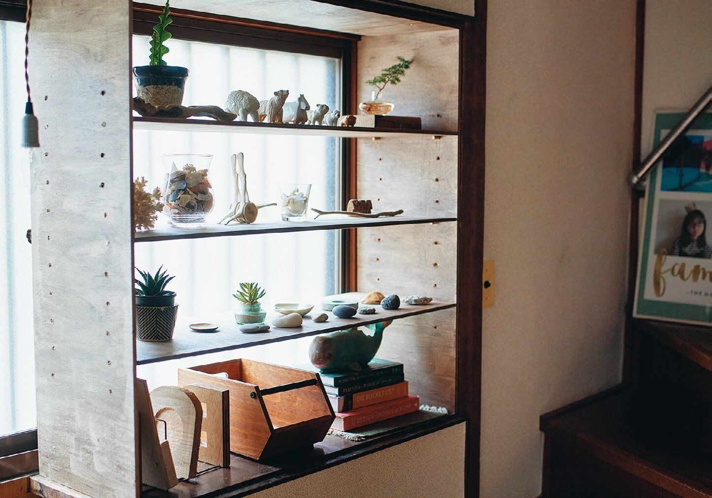 階段下の窓前には板を3枚渡し、お気に入りを飾るスペースに。飾るのは拾った石や貝殻、木の枝など。拾った場所や時期が違っても不思議と調和するのが自然素材のいいところ。