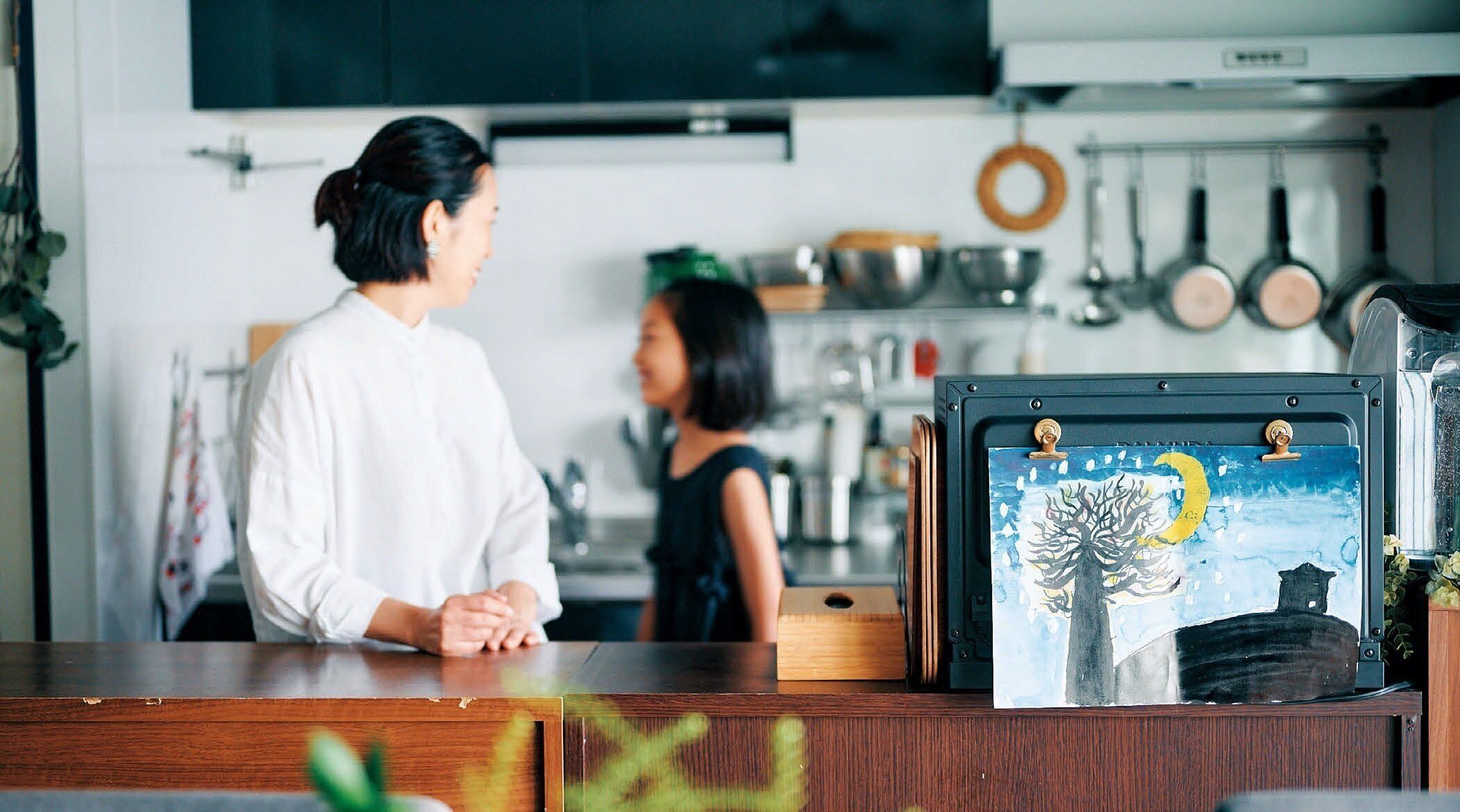 子どもの絵画やお習字は、持ち帰ったら間髪入れずに電子レンジの裏にペタッ。「一週間ほど飾って家族で鑑賞し、その後処分か保管かを子どもと一緒に判断」リビングが子どもの物だらけにならない秘訣。