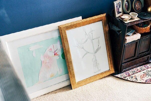 額装した絵は壁に飾らず、無造作な感じで床置きすることも。「額を数枚、ずらして重ねると、おしゃれで置きっ放し感が出ません」。