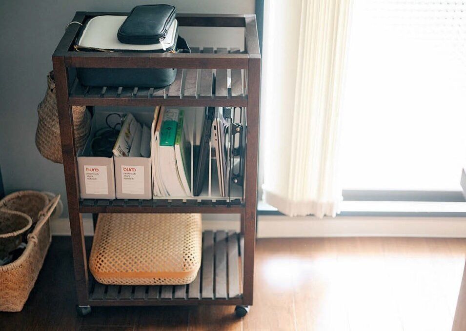 リビングのテーブルで仕事や勉強をすることも多いあつみんさん母娘。テーブルの奥に一時置き場としてワゴンをスタンバイさせれば、「テーブルの上、片づけて!」と家族にイライラしなくてすみます。