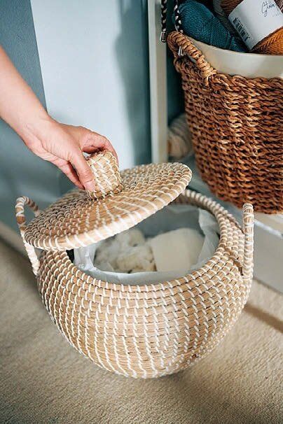 リビングとキッチンの間に置くゴミ箱を探したものの、「プラスチック製は違う」と、納得いく物を見つけられず。そこで元からあったふたつきかごをゴミ箱に!