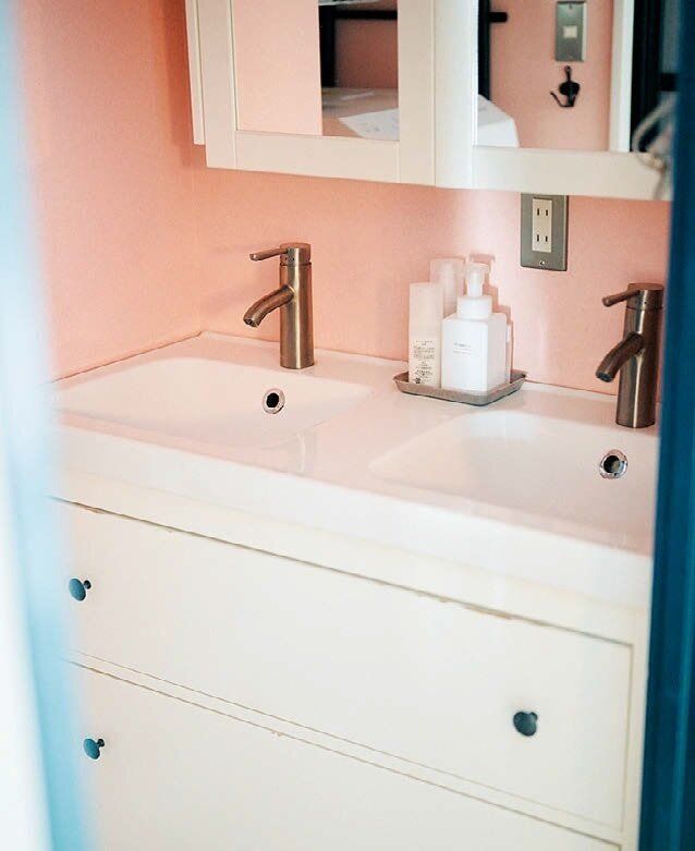 「以前は毎朝混んでカオスだった」いう女4人、あつみんさん家の洗面所。「リノベーションしてIKEAの二口洗面台に換えて大正解でした」。