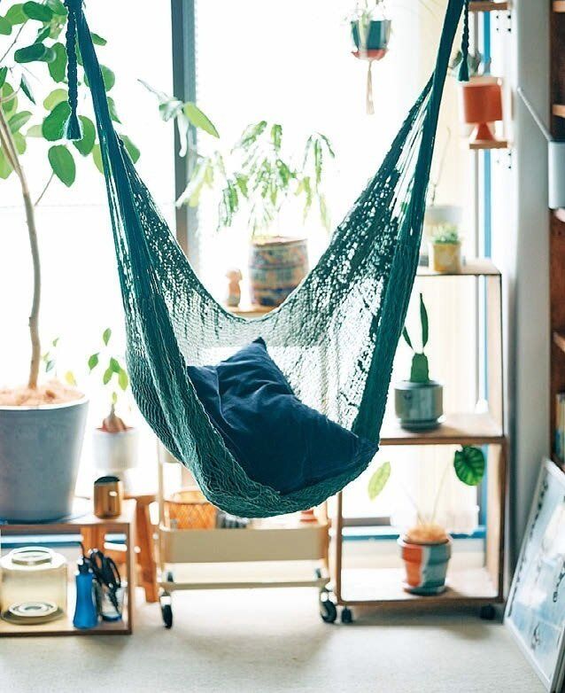 「乗って読書したい」と夢見ていた“本棚前のハンモック”。空間になじむモスグリーンを選び、工務店に設置を依頼。100kgまで荷重がかかっても大丈夫。