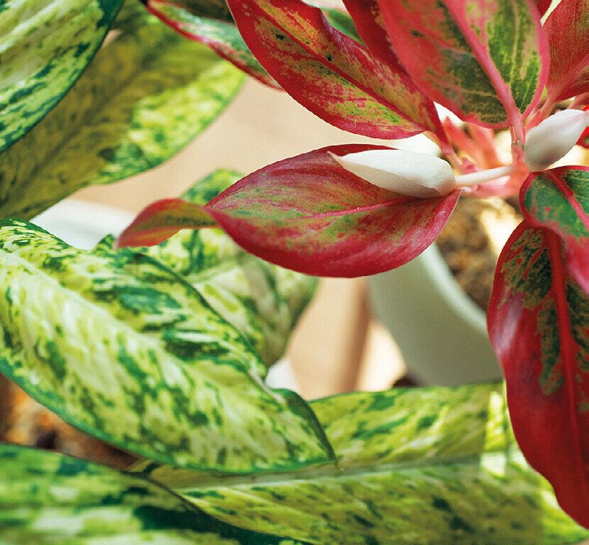 “グリーン〞といっても、色や柄はさまざま。「葉っぱに柄があるものは、個性が豊かで華やかに見えます。じつは葉の形、生え方もあえて違うものを選んで並べています。海外のオシャレな家を参考にしてみましたが、不思議とこなれて見えます」。