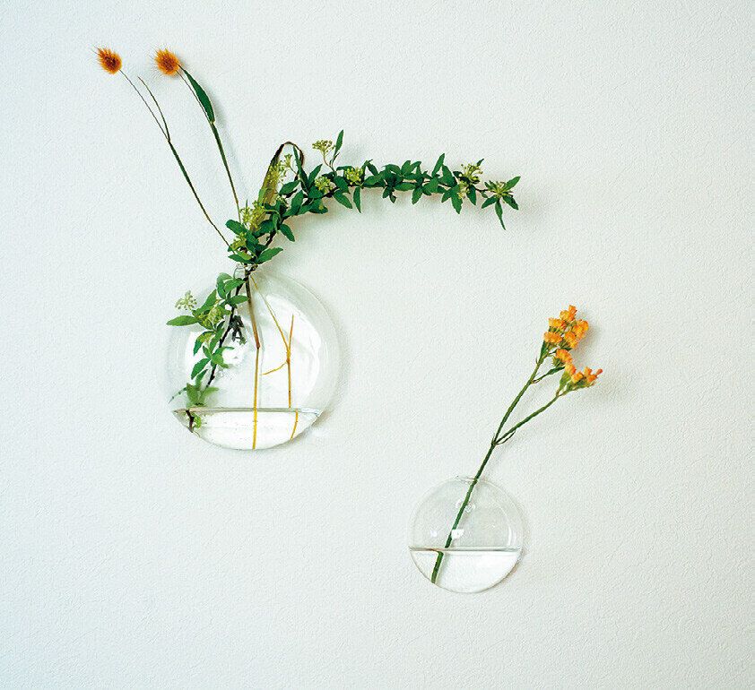 壁かけ式のフラワーベースに切り花を飾るのもオススメ。子どもの手が届かない位置にかければ、ひっくり返される心配がありません。「半球型の容器を、石膏ボード用のピンでかけています。『オルネ ド フォイユ』で購入しました」。
