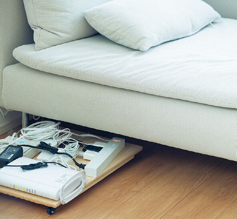 ナチュラルな雰囲気と合わない電子機器は目に入らない場所に隠すのが、オシャレに飾るコツ。「適当な大きさの板にキャスターをつけただけ。使うときだけソファの下から引き出しています。配線もごちゃつかず、掃除もしやすいんです」。