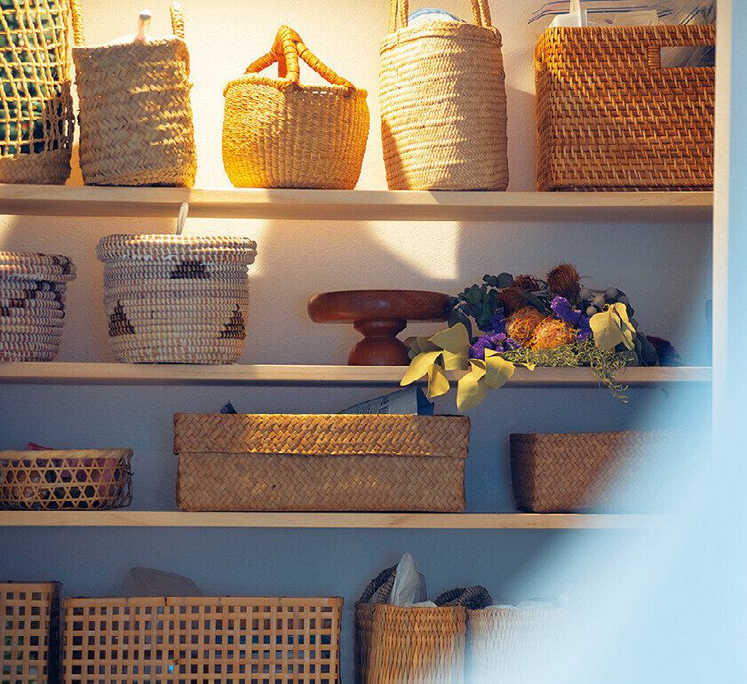 「パントリーの棚にドライフラワーをさりげなく置いています。収納に使っているカゴとの相性も抜群。パントリーに入ったとき、パッと目に入って癒やされますね。日が当たらないところでも、ちょっとした隙間でも、ドライフラワーなら置けます」。