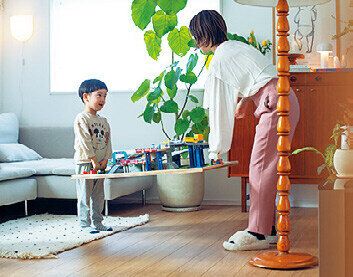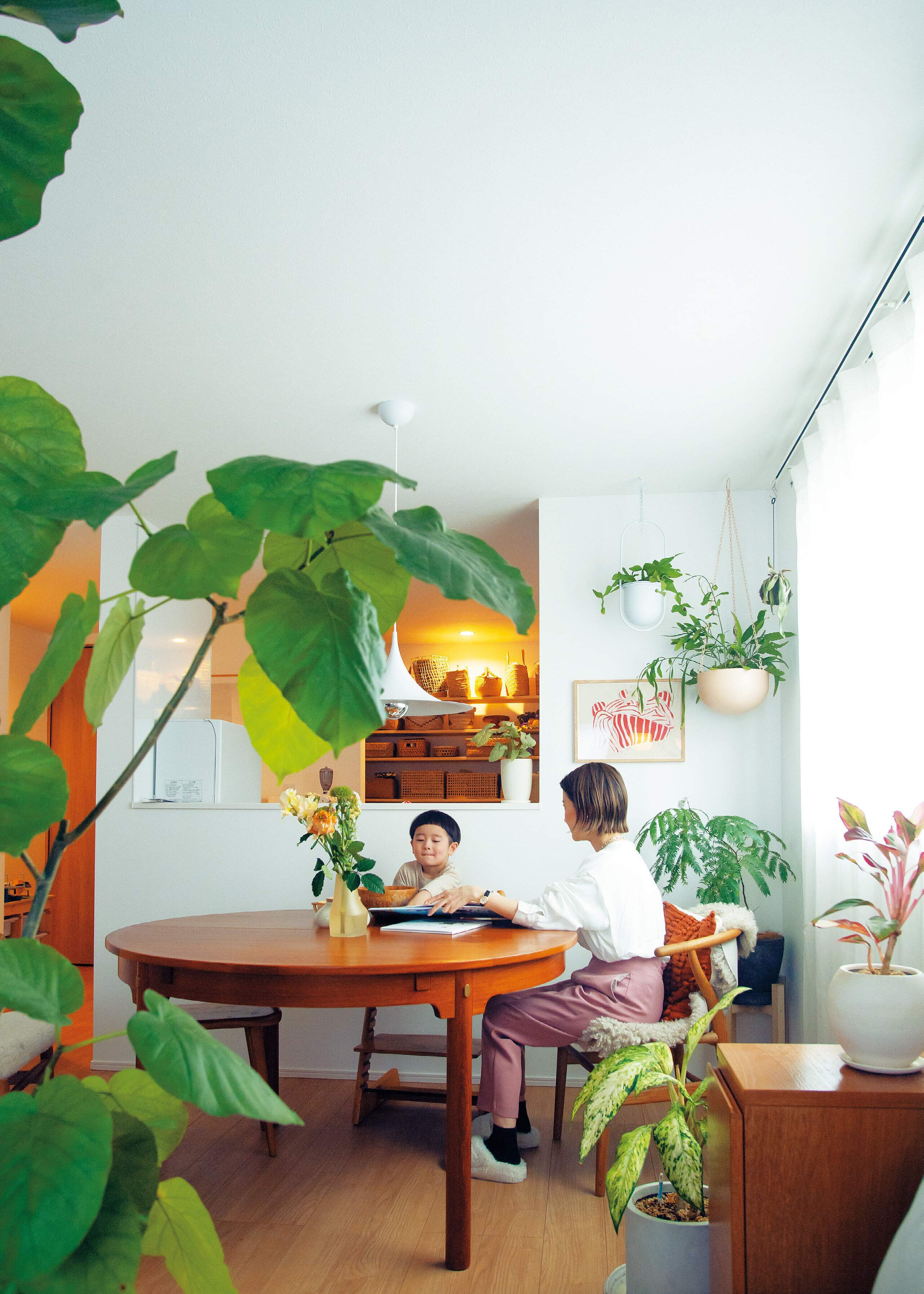 「天井に飾れば危なくないし、手に届くものも触りたがるのは最初の1週間くらい。新芽を見て“赤ちゃん葉っぱ”と興味を持ってくれるのは、うれしい誤算でした。観葉植物のお世話も毎日水をやる必要がないので意外とラク。理想の空間が手に入り、毎日すごく癒やされています」。