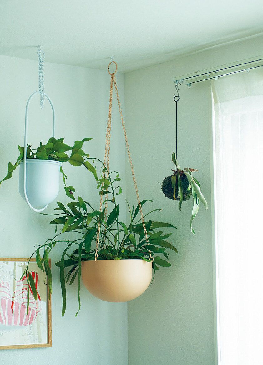 「天井を使えば、子どもが何歳からでもグリーンを始められます。最近は鉢の種類も充実していますし、好きな場所につるせるのも魅力。つるすグリーンは、軽いものを選ぶのがコツです」。