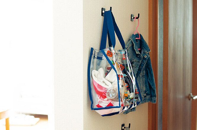 大きいおもちゃは棚の上には置かず、中にしまうのがルール。適当に置いてもOK。習い事用バッグは廊下の壁を活用。100円均一のフックを石膏ボード用のピンでとめて、原状回復できる収納に。