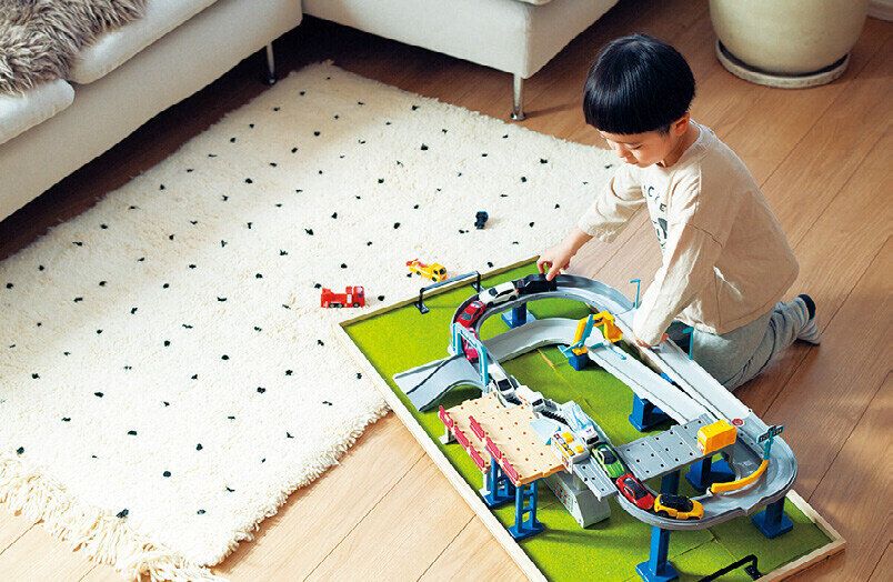 ボードにおもちゃを全て載せて移動するだけなのでラク。ボードは板をホームセンターでカットしてもらい、100円均一の角棒でフチをつけたもの。「特別な道具が不要で簡単にDIYできます」。