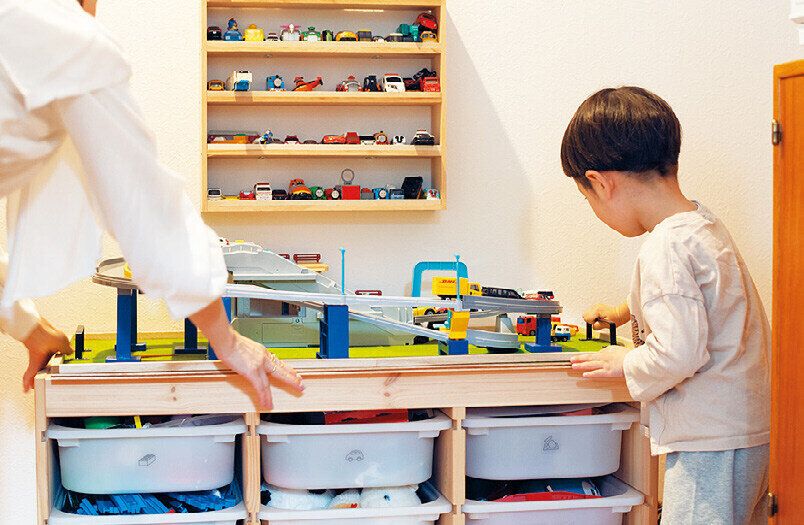 「リビングで遊ぶので、おもちゃはリビングと隣接するキッチン脇に棚を設置。見えない場所に移動させるだけなので、おもちゃが散らかっても、あっという間に片づけられますよ」。