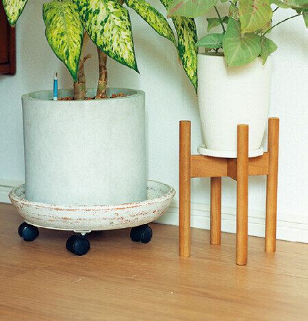 小さなグリーンはスタンドに。大きめの鉢は100円均一のキャスターに受け皿ごと載せて。「子どもがいると家事も時短が命。掃除機をかけやすくなり、時間が短縮できます」。