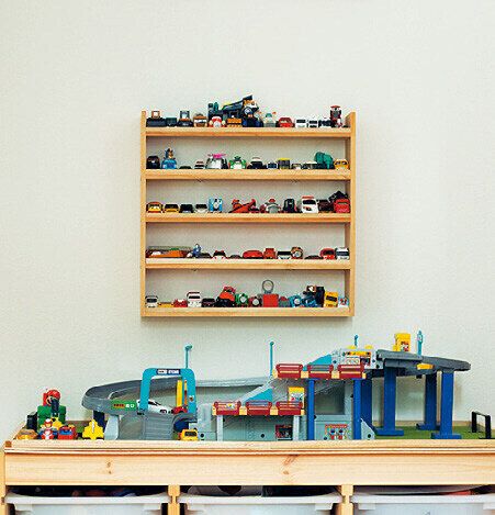 100円均一の木材をボンドで貼っただけで棚が完成。「壁づけすると、遊びたいミニカーを子ども自身が見つけられるし、1人で片づけられるように!」。