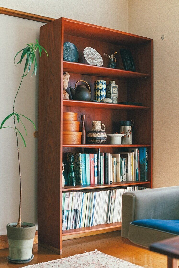 大きめの本棚には、インテリア雑誌や写真集などを収納。それも、下2段だけにまとめているので、圧迫感がありません。上3段は、余裕を持たせて好きな物を飾るスペースに。