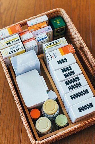 左側の扉の棚には、「救急ボックス」を。「紙袋に入っていた処方薬は、100均の白いケースに移し替え、ラベルで中身を表示。スッキリ収まり、探すのも出し入れもラクです」。