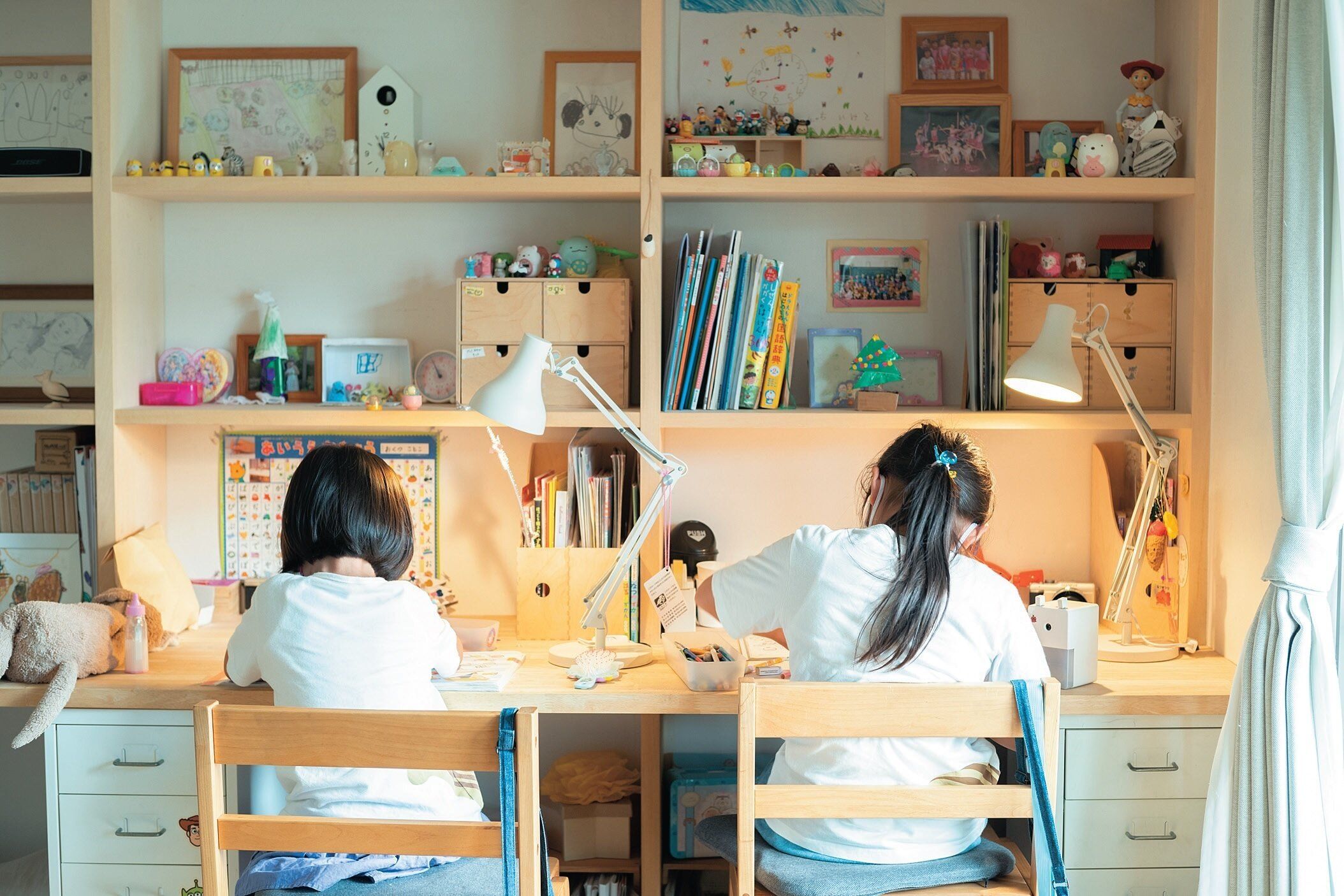 2人の娘はお絵描きや工作、折り紙が好き。遊びに集中すると机の上には物が重なり、カオス状態に。「作業スペースがなくなるほど散らかったら声をかけ、一緒に片づけています」。