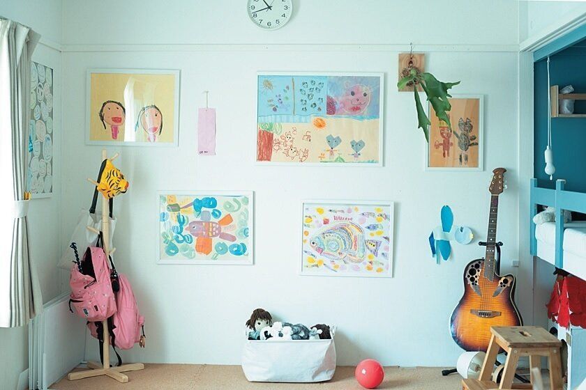 描いた絵や工作などは「取っておいてね」と言う娘たち。でもしまい込むとたまる一方だから、お気に入りの絵はすぐ飾り、壁面をギャラリー風に。学期の終わりに親子で一緒に見直し、古い物から処分。
