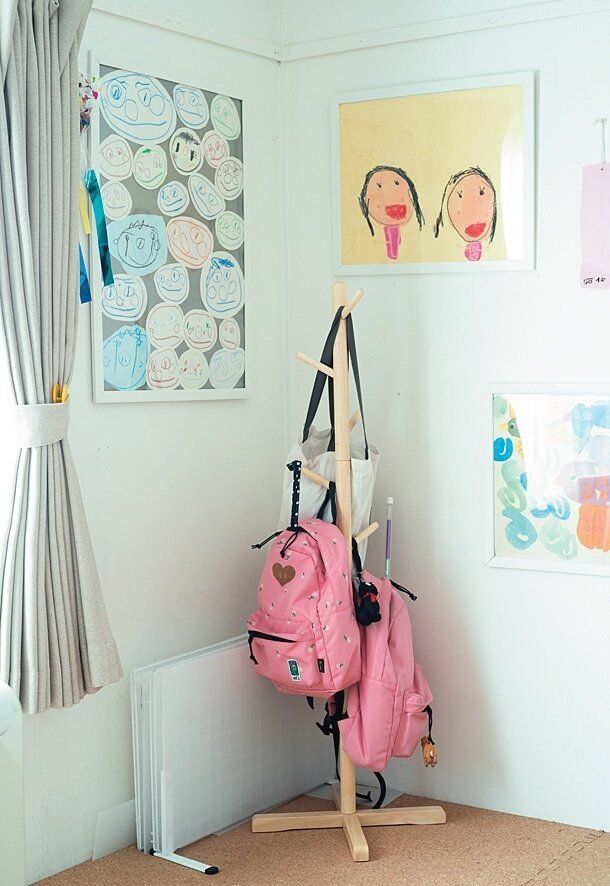 習い事のバッグや上着などを床に放置するのはNG。とはいえ、全部に置き場所をつくると、いちいち戻すのが子どもたちにとって面倒だから、部屋の隅にあるポールハンガーにまとめて「ざっくり掛ければよし」に。